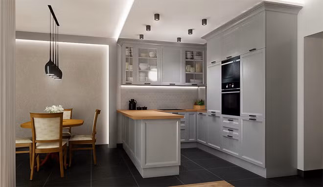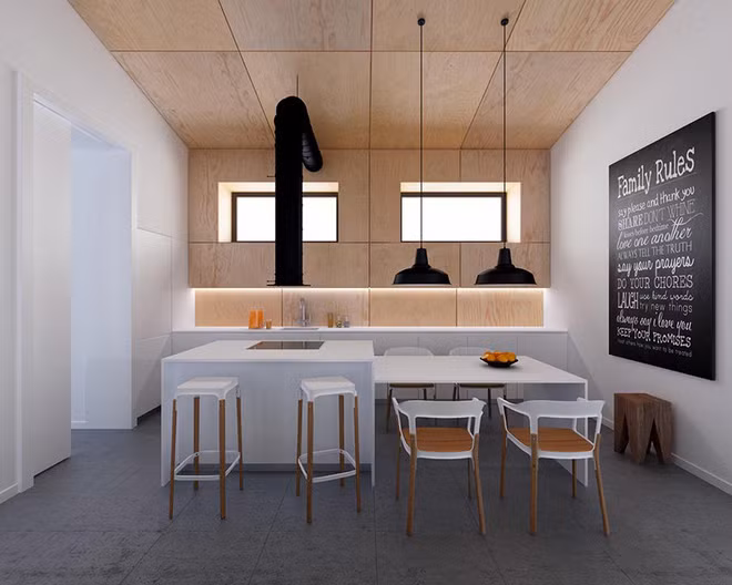 Với những căn bếp nhỏ được thiết kế theo phong cách tối giản thì việc sử dụng đèn led âm chính là cách hay nhất để tạo điểm nhấn cho căn phòng.