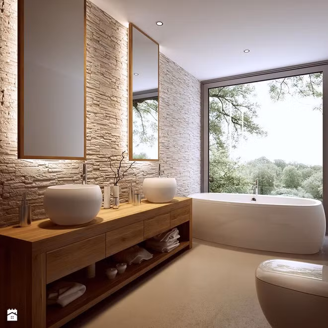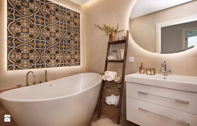 Hệ thống đèn led âm bên dưới gương và mảng tường gạch bông khiến căn phòng tắm trông vô cùng ấn tượng.