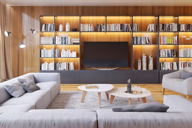 Hệ thống đèn led âm mang đến vẻ đẹp ấn tượng cho giá sách bên trong phòng khách.