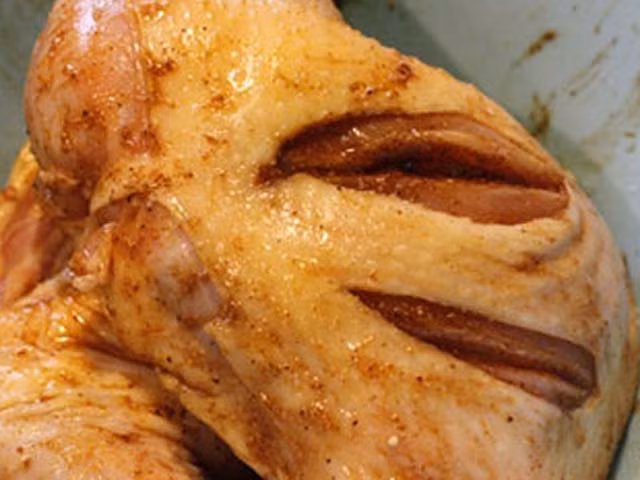 Bước 1 (sơ chế và tẩm ướp gia vị): Đùi gà rửa sạch, khứa nhẹ vài đường lên thân gà. Cho vào tô đựng gà một thìa nhỏ ngũ vị hương, một thìa súp mật ong, một thìa nhỏ đường, một thìa nhỏ muối, hai thìa súp nước mắm, hành khô thái nhỏ. Thoa đều hỗn hợp gia vị lên bề mặt đùi gà, ướp khoảng 3 tiếng.