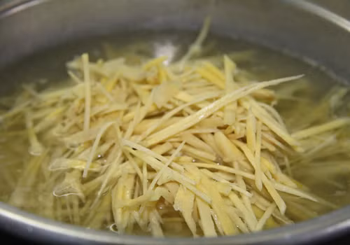 - Cho gừng vào chần với nước trong khoảng vài phút, sau đó vớt ra xả sạch với nước lạnh vài lần cho hết phèn.