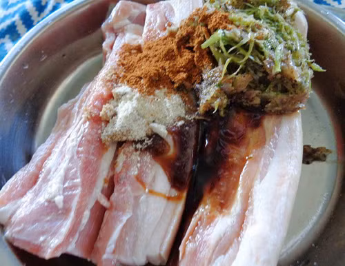 Để làm thịt xá xíu, bạn nên chọn thịt ba chỉ, không chọn các loại thịt lợn khác như thịt mông sấn, lạc vai. Cùng gẫn giống như cách làm thịt quay, thịt ba chỉ mua về bạn pha chút xíu muối, dùng dao cạo phần dơ trên da. Sau đó rửa qua nước lạnh thật sạch và thái miếng dài to bảng. Tỏi, tiêu, hành tím, hành lá và ngò cho hết vào cối giã nhuyễn.