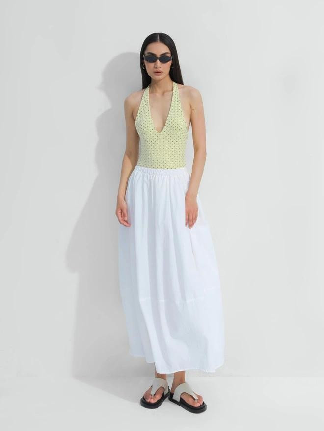 Áo sơ mi vải tơ màu trắng ngà kết hợp chân váy xếp ly màu xám lông chuột là gợi ý mặc đẹp thanh lịch, vẻ đẹp giản đơn vẫn có thể tỏa sức hút ngọt ngào Từ đầm liền đến set đồng bộ, những lựa chọn về màu sắc và trang phục mùa hè mở ra cho quý cô vô số phong cách thời trang đặc sắc, ấn tượng Đầm cổ yếm dáng bí tươi vui như chính gam màu vàng hiền hòa rạng rỡ. Nàng có thể chọn bản phối này cho những buổi dạo phố, cho những ngày hè trên bãi biển hay cho buổi hẹn lãng mạn cuối tuần
