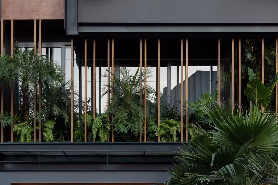 Cách mà nhóm kiến trúc sư giải bài toán nắng hướng Tây là sử dụng tổ hợp các lớp che chắn thông minh. Mặt tiền hai lớp được thiết kế linh hoạt cho từng tầng. Tầng một là nơi đặt phòng ngủ chính, được bảo vệ bởi hệ cửa kính Low-E cách âm, cách nhiệt, kết hợp với lam gỗ và cây xanh tạo thành lớp đệm không khí, cản nắng trực tiếp và đem lại sự yên tĩnh. Tầng hai lại chọn giải pháp đối thoại với ánh sáng bằng một hệ cửa sắt đục lỗ điều khiển tự động, kết hợp với cửa kính trượt phía trong. Khi ánh nắng đi qua lớp vỏ dày sẽ không còn gay gắt mà trở thành những dải sáng chuyển động, thay đổi theo từng giờ trong ngày.