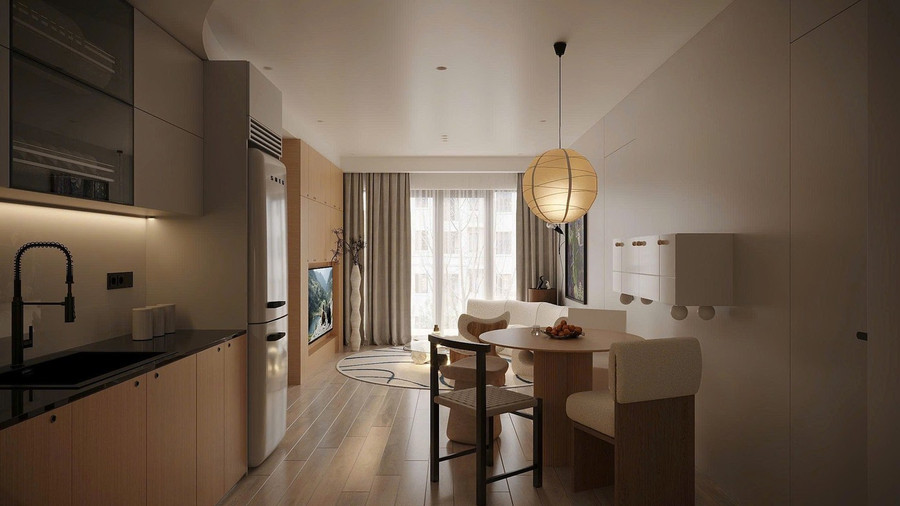 Khu vực khách bếp thiết kế sử dụng tông màu trung tính làm chủ đạo như kem, be, trắng sữa và vàng nhạt