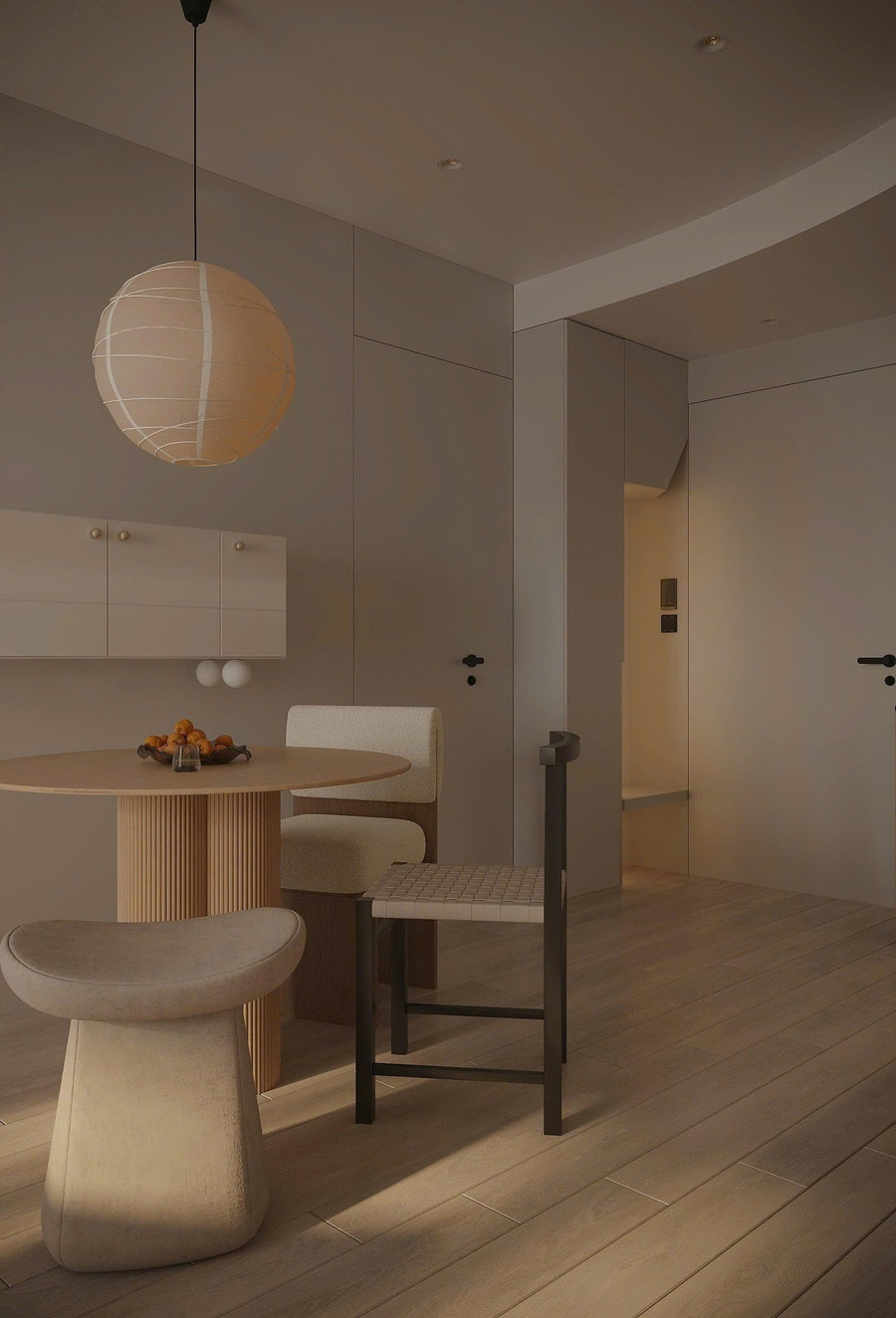 Khu vực khách bếp thiết kế sử dụng tông màu trung tính làm chủ đạo như kem, be, trắng sữa và vàng nhạt. Màu sắc này đóng vai trò như một bức nền hoàn hảo để tôn vinh các tác phẩm nghệ thuật và đồ nội thất có hình khối lạ mắt.