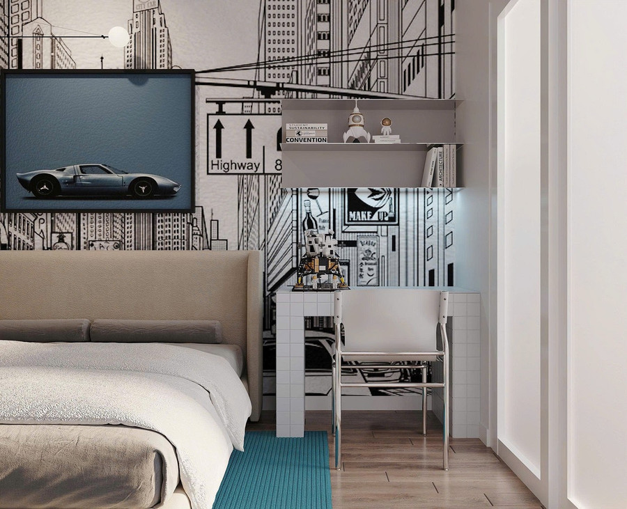 Phòng ngủ phụ là một không gian lấy ý tưởng từ sở thích đam mê tốc độ và công nghệ của gia chủ, kết hợp với phong cách graffiti đường phố. Mảng tường đầu giường sử dụng tranh graffiti đen - trắng lấy cảm hứng từ những con phố đô thị sôi động, tạo chiều sâu thị giác và cảm giác chuyển động liên tục, như nhịp sống của thành phố.
