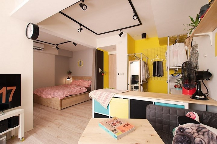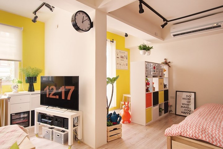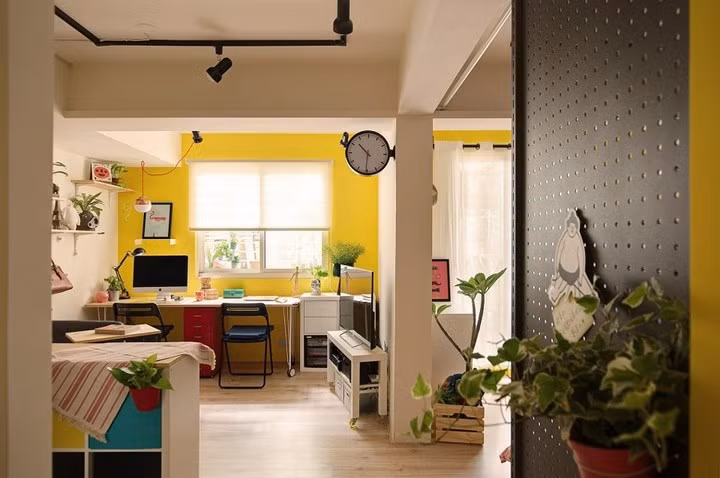 Điều mà phần lớn căn hộ dưới tầng hầm thiếu đó chính là ánh sáng, do vậy màu vàng được thêm thắt mang đến không khí tươi mới cho căn hộ.