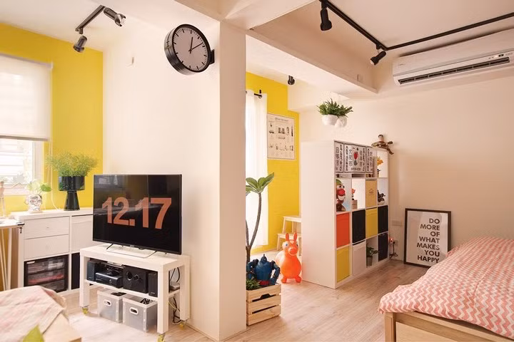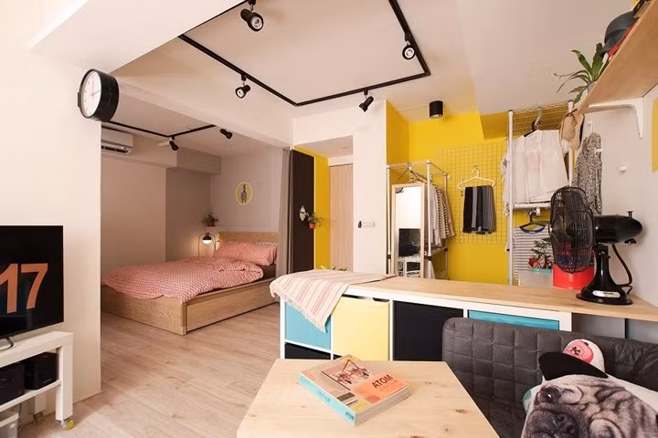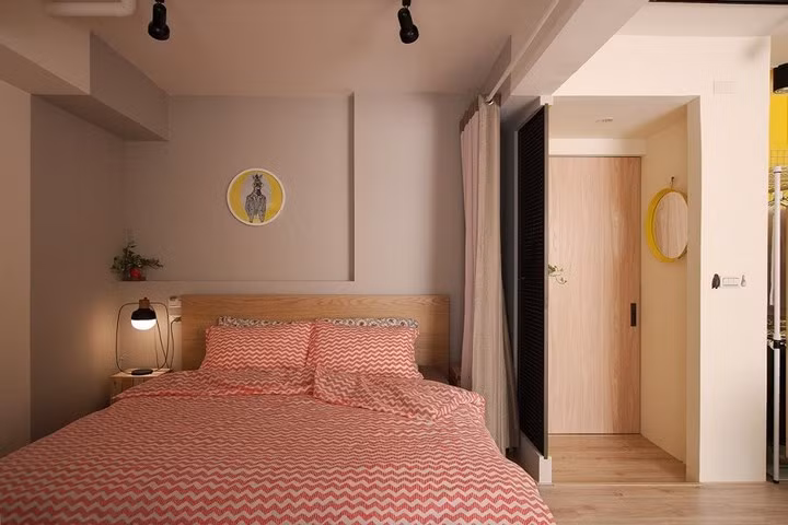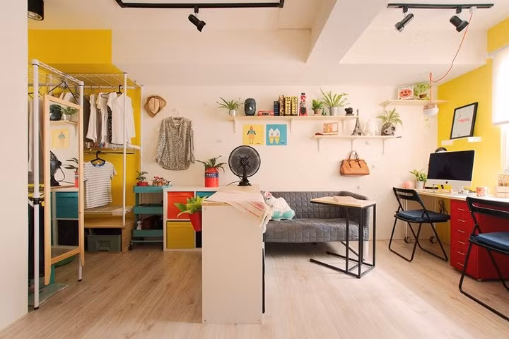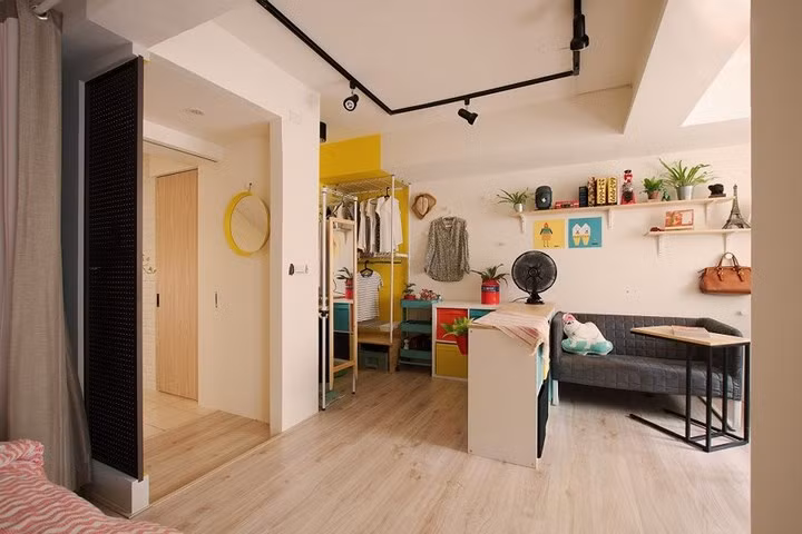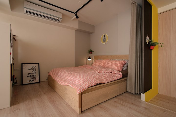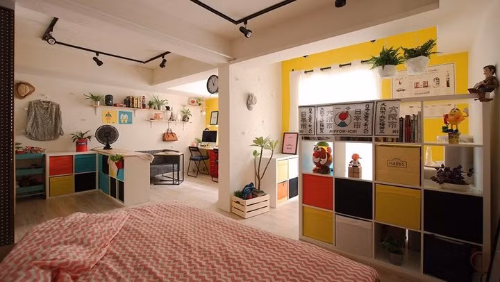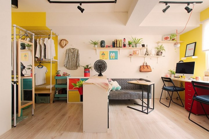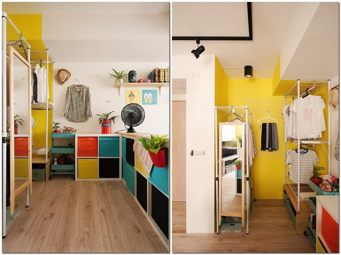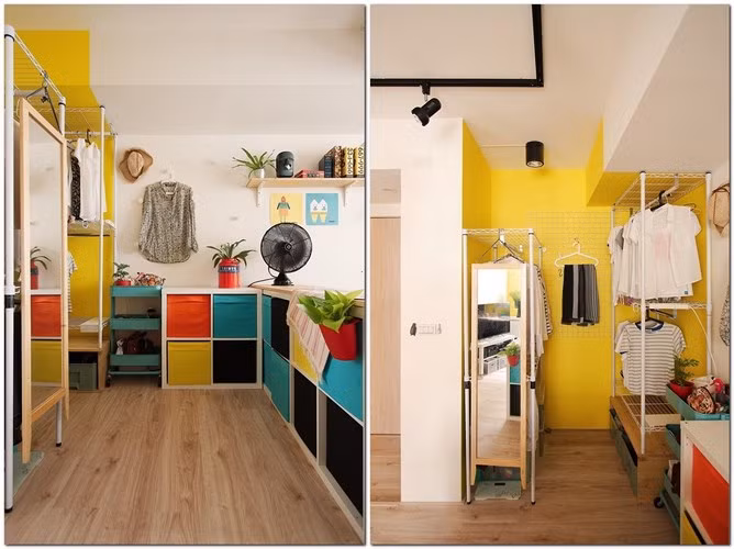 Khu vực để quần áo sắp xếp riêng và cũng không thiếu màu sơn tường rực rỡ.