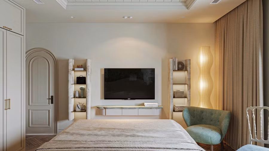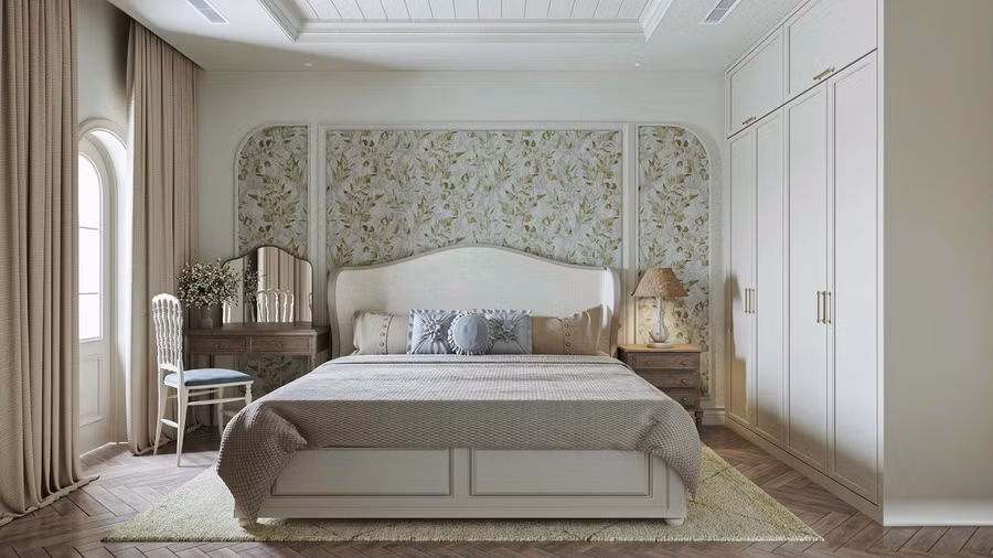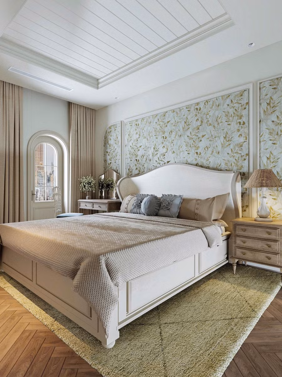 Phòng ngủ master thiết kế có nét cổ điển nhưng tiết chế nhằm giữ lại sự đơn giản với mong muốn không gian thực sự yên bình và tái tạo năng lượng. Hơi hướng chất Modern Farmhouse - nơi hòa quyện giữa nét đẹp đồng quê và sự tinh tế hiện đại.
