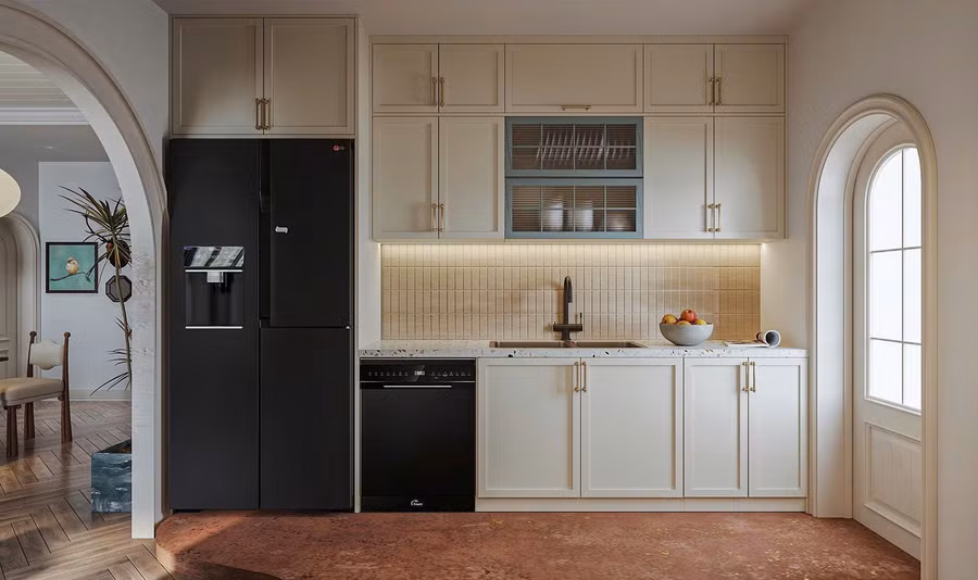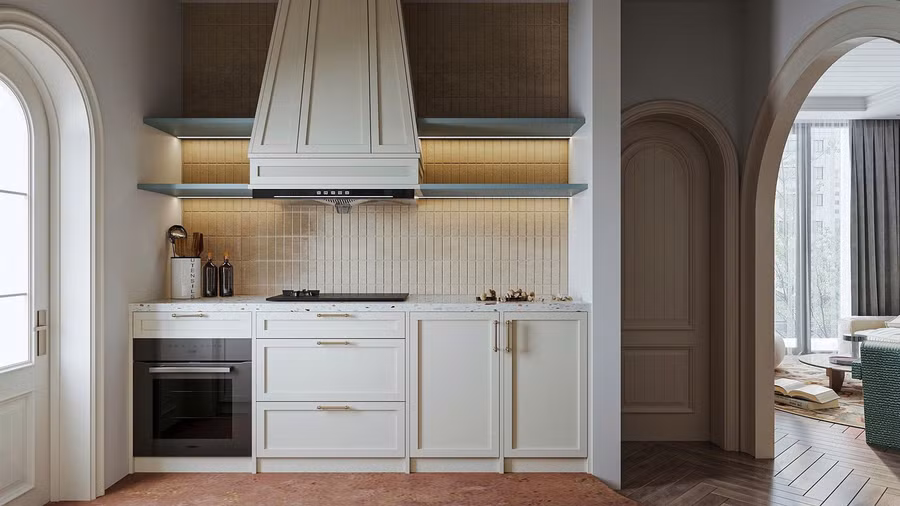 Khu bếp được thiết kế như một “ốc đảo lửa” ấm áp, nằm gọn trong tổng thể không gian mở nhưng vẫn có cá tính riêng. Nền bếp được xử lý tách biệt khỏi không gian sinh hoạt chung với gam đỏ cam đất được lựa chọn không chỉ để phân khu chức năng, mà còn tạo cảm giác ấm áp, không cần vách ngăn nhưng vẫn đủ rõ để giữ sự gọn gàng, sạch sẽ trong quá trình nấu nướng hằng ngày.