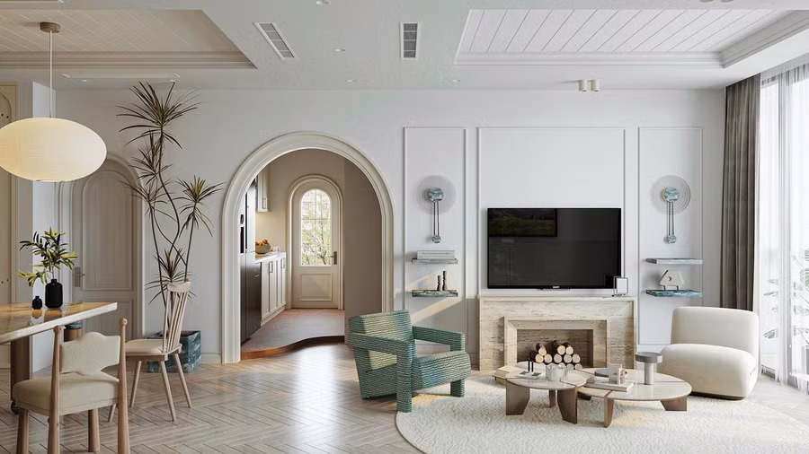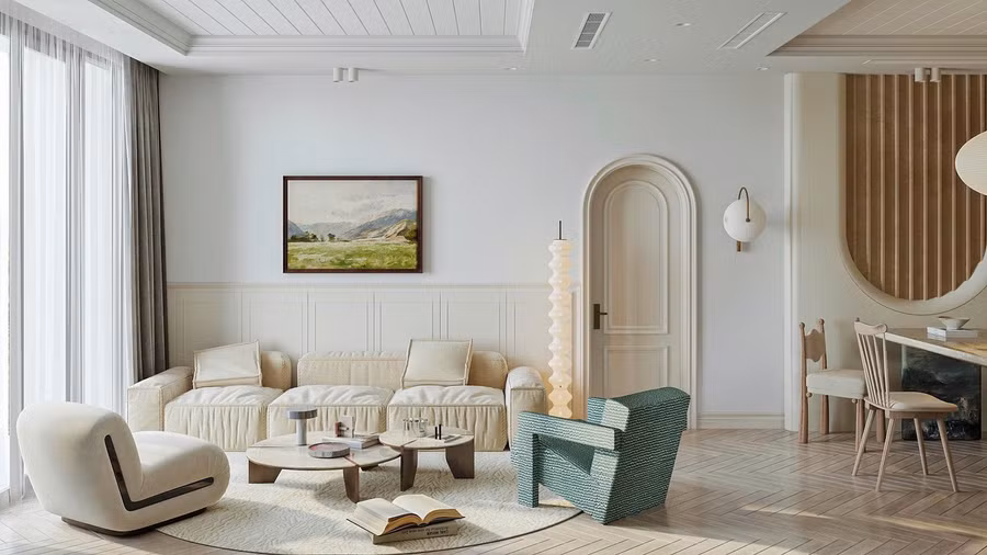 Phòng khách thanh lịch với bảng màu chủ đạo là trắng - kem - vàng nhạt, gợi cảm giác của cát mịn dưới nắng sớm. Tông màu này phủ đều từ tường, trần cho tới nội thất, tạo sự liền mạch và nhẹ nhàng.