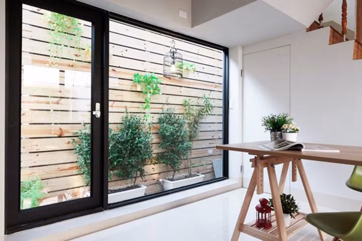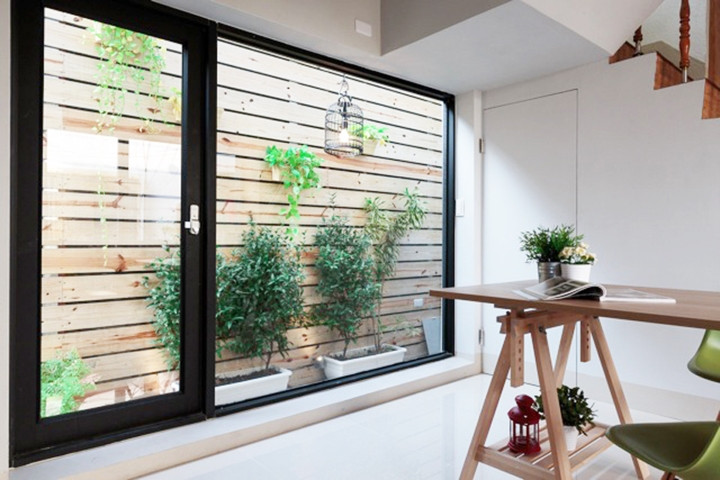 | Khung cửa sổ bằng sắt cũ được thay thế bằng bậu cửa gỗ có thể làm bàn uống nước, đọc sách. 7 Từ phòng ăn các thành viên cũng có thể di chuyển ra vườn thông qua cửa kính ở cuối phòng. |