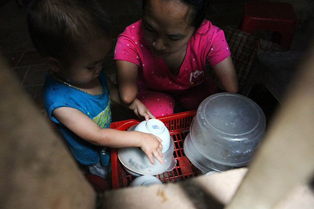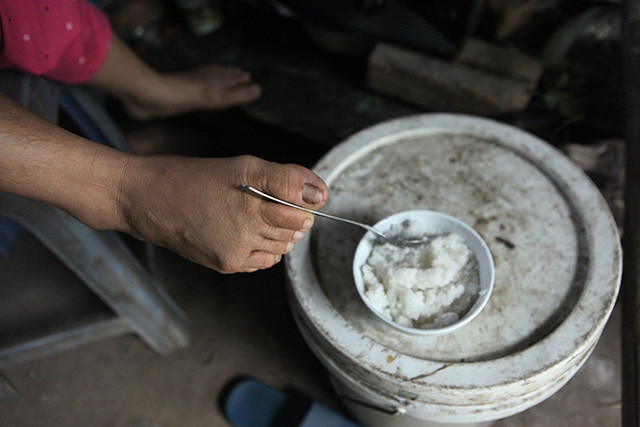 Chị chủ yếu sử dụng đôi chân để làm việc, nhiều khi bữa cơm của hai mẹ con chỉ có cháo loãng.