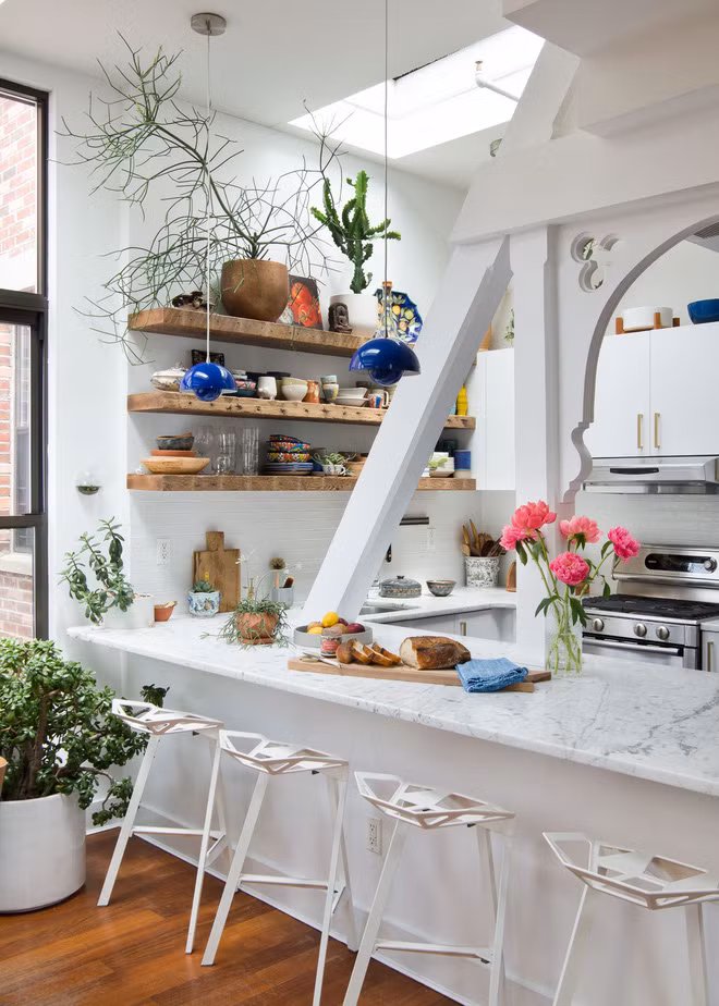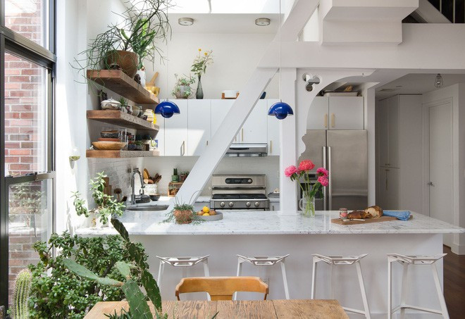 Để căn bếp thêm hoàn hảo, những chiếc đèn thả màu lam đã được thêm vào nơi góc bàn bar. Trong không gian trắng, bộ đèn thật nổi bật và khiến căn bếp nhỏ xinh đẹp càng thêm ấn tượng. Thêm vào đó, những bình hoa, chậu cây xinh đẹp cũng góp công lớn, giúp cho các bà nội trợ không thể rời mắt khỏi góc bếp này.