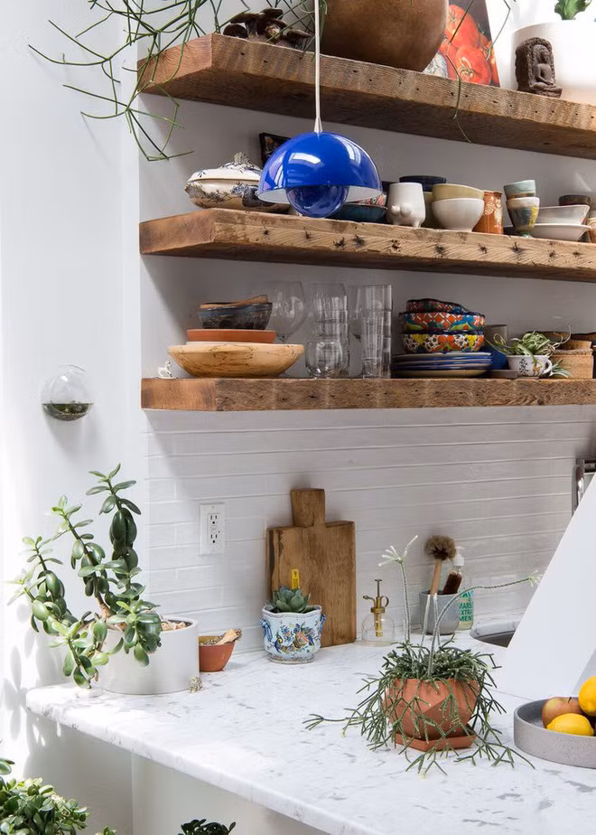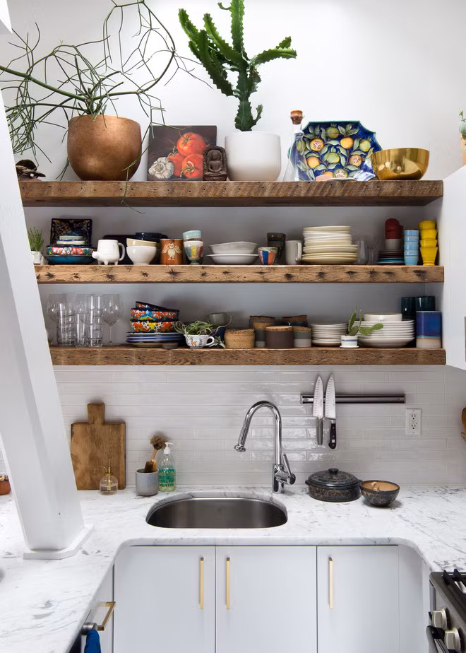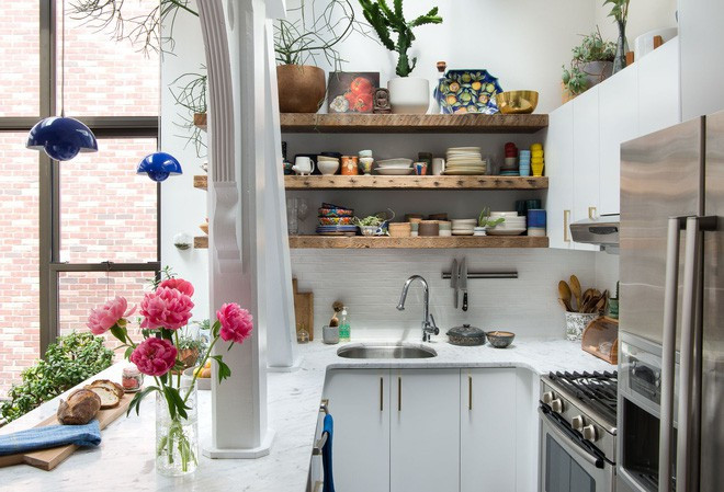 Đặc biệt nhất trong khu bếp này phải kể đến những hệ kệ mở làm từ những tấm gỗ mộc. Bề ngoài xù xì nhưng những tấm gỗ này hoàn toàn ăn khớp với không gian bếp trắng. Đồng thời những chiếc đĩa, bát màu sắc, những chậu cây xinh xắn được chọn lựa và sắp đặt khéo léo cũng góp phần mang đến cho góc bếp này vẻ đẹp không cưỡng nổi.