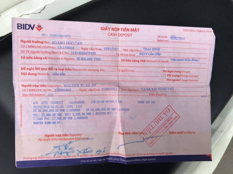 Một giấy nộp tiền 50 triệu đồng mà anh an cung cấp cho PV có ghi người nhận tên là Hoang Duc Can.