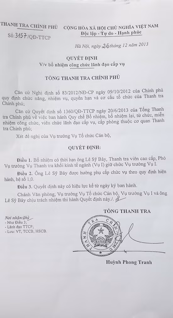 Quyết định về việc bổ nhiệm ông Lê Sỹ Bảy giữ chức Vụ trưởng Vụ Thanh tra khối kinh tế ngành (Vụ 1, TTCP)
