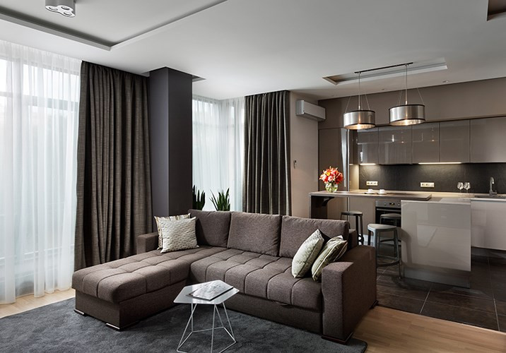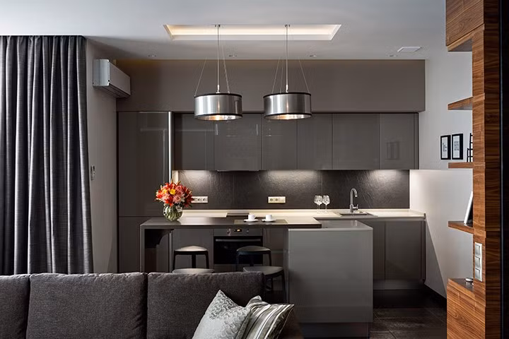 Mặc dù có diện tích nhỏ, nhưng căn hộ trông đẹp và tinh tế nhờ sử dụng màu sắc tương phản xám đen và trắng. Nó cũng có các nội thất bằng gỗ và sử dụng kính để tạo cảm giác rộng lớn cho không gian.