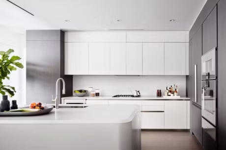 Một căn bếp hiện đại với màu trắng theo phong cách tối giản phù hợp với không gian.