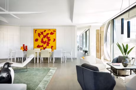 Phòng khách rộng rãi, tràn ngập ánh sáng. Ngay khi bước vào căn phòng, gia chủ và khách có thể chiêm ngưỡng khung cảnh tuyệt vời của thành phố qua các bức tường bằng kính.