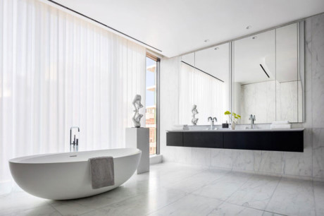 Phòng tắm lát đá cẩm thạch trắng, tinh tế, trang nhã.