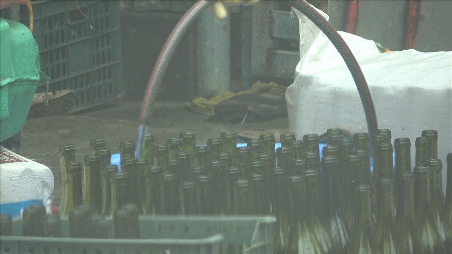 Ở bên ngoài xưởng, hàng ngàn chai sành cũ dạng sâm panh và vang nho được nhập về từ nhiều nơi, sục rửa một lần duy nhất trước khi được sử dụng để đóng rượu thành phẩm. Một mẻ rượu mới chuẩn bị "cháy" hàng.
