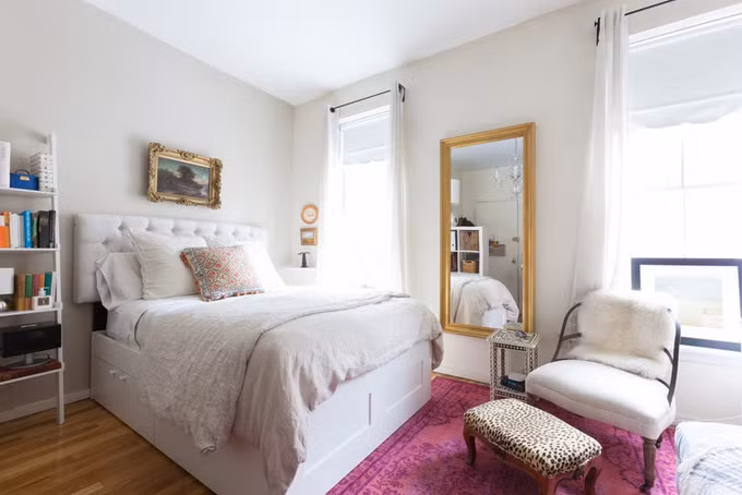 Một vài chi tiết nhỏ như thảm màu hồng, ghế màu xanh nhạt hay bộ tranh đơn giản giúp không gian mềm mại hơn.