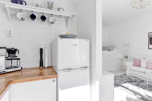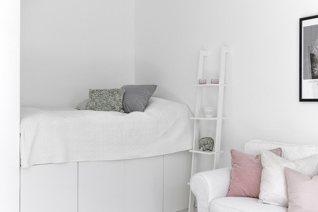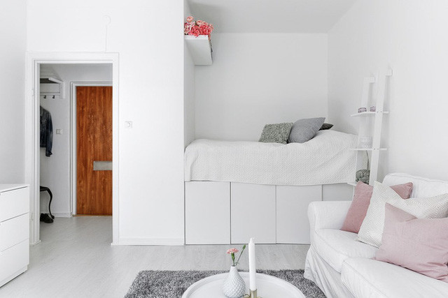 Giường ngủ đưa lên cao và tủ kệ phía dưới giúp căn hộ gọn gàng.