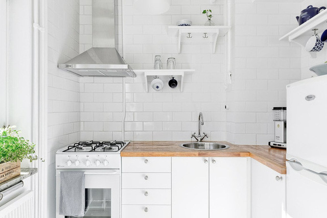Khu bếp gọn gàng nhưng đầy đủ nội thất.