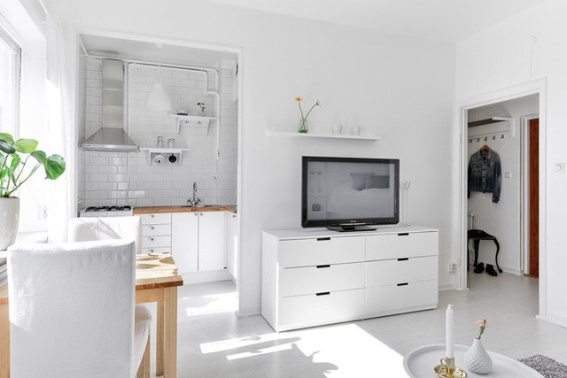 Vì diện tích nhỏ nên tất cả các không gian đều được bố trí trong một mặt bằng. Phòng khách rất đơn giản chỉ là một sofa nhỏ và một bàn nước cơ động.