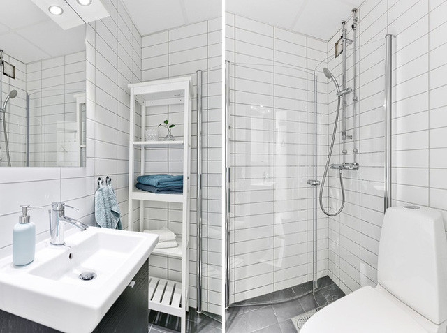 Khu phòng tắm nhỏ gọn với khu tắm bằng vách kính có thể gấp gọn sau khi dùng, đảm bảo sự gọn gàng cho không gian.