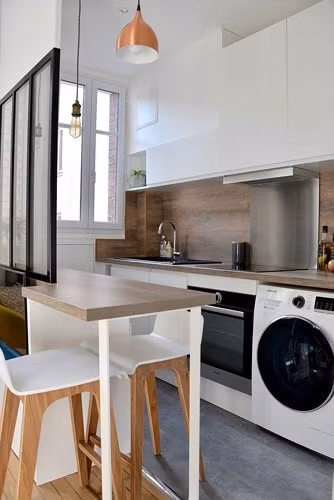 Khu vực nhà bếp sử dụng tông màu sáng, lắp đặt đầy đủ các thiết bị. Bàn ăn dành cho 2 người cũng được thiết kế tinh tế.
