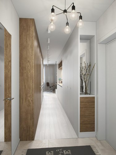 Hành lang sâu hun hút với tường màu trắng và màu nâu gỗ.