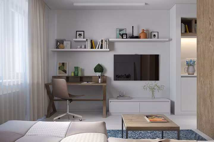 Bàn làm việc đặt giữa cửa sổ và kệ ti vi, giá sách treo tường dùng để trưng bày những món đồ yêu thích.