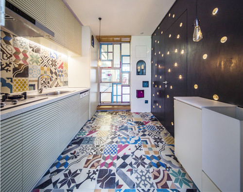Khu bếp là nơi thể hiện chất nghệ sĩ của cặp vợ chồng trẻ. Sàn nhà, phần tường bếp được ốp gạch hoa.