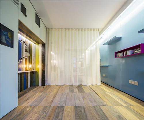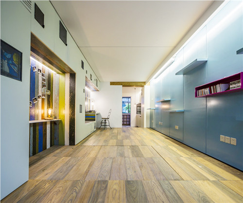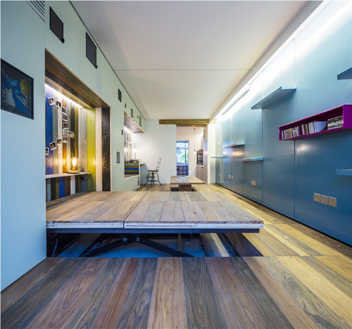 Khi sửa căn nhà 30 m2, một cặp vợ chồng nghệ sĩ quyết định loại bỏ gần hết đồ đạc cũ, áp dụng các giải pháp nội thất thông minh. Khi mới bước vào nhà, khách sẽ cảm thấy nhà rất rộng nhưng lại thiếu các tiện nghi cần thiết như chỗ ngủ, phòng ăn.