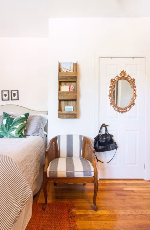 Những chiếc kệ nhỏ, đơn giản giúp căn hộ có thêm không gian lưu trữ. Ở đây, chỉ bằng những mảnh gỗ thô mộc, chủ nhà đã có kệ sách đầu giường.
