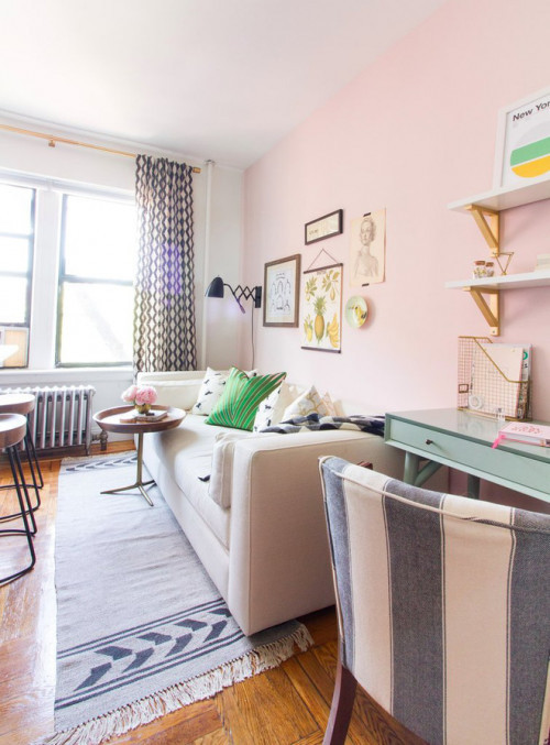 Với nền tường màu hồng nhạt, gam màu pastel nhẹ nhàng của nội thất và cách bài trí thông minh, chẳng ai có thể phủ nhân được tính thẩm mĩ và sự tiện nghi của căn hộ. Và có lẽ với những người độc thân hay cặp đôi trẻ, thì một căn hộ thế này cũng quá đủ để trở thành một tổ ấm lý tưởng rồi.