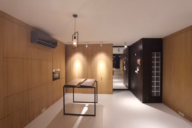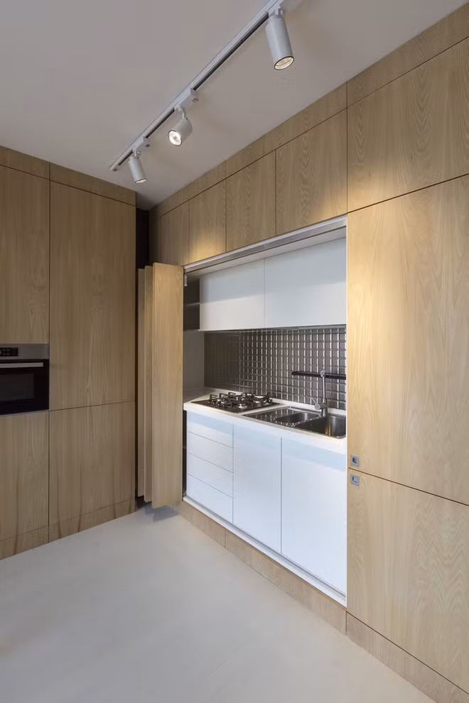Ngay cả khu bếp nấu cũng được ẩn gọn gàng sau những cánh cửa gỗ, vừa gọn gàng, vừa đủ chức năng.