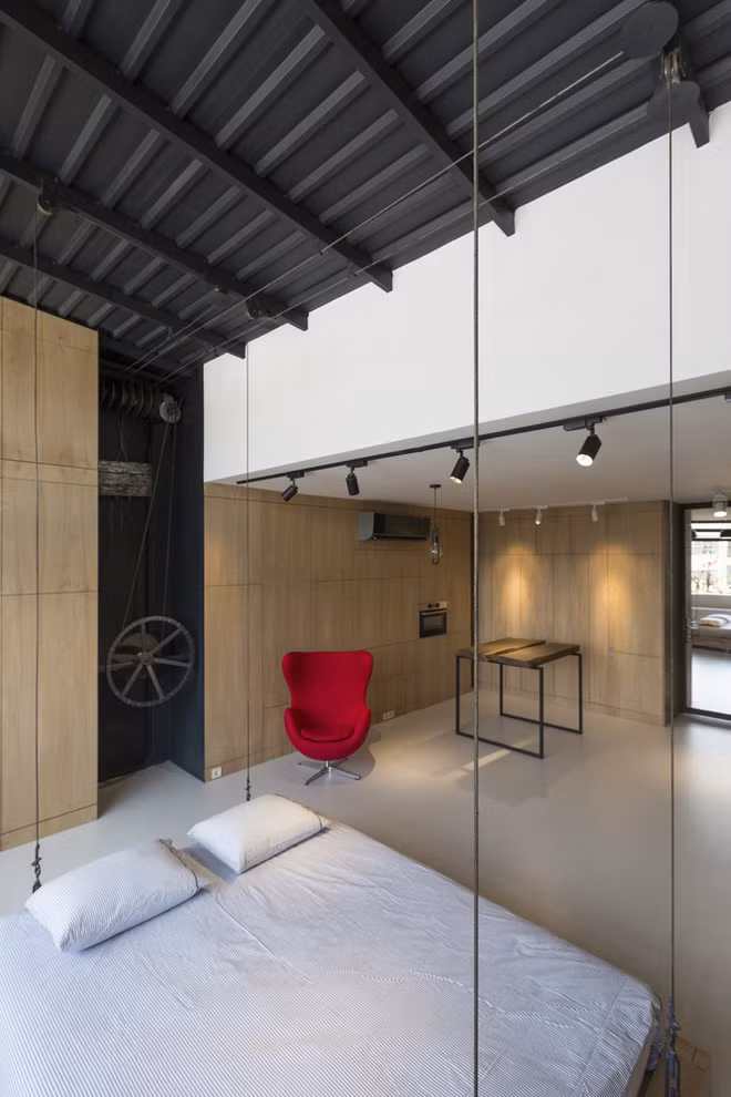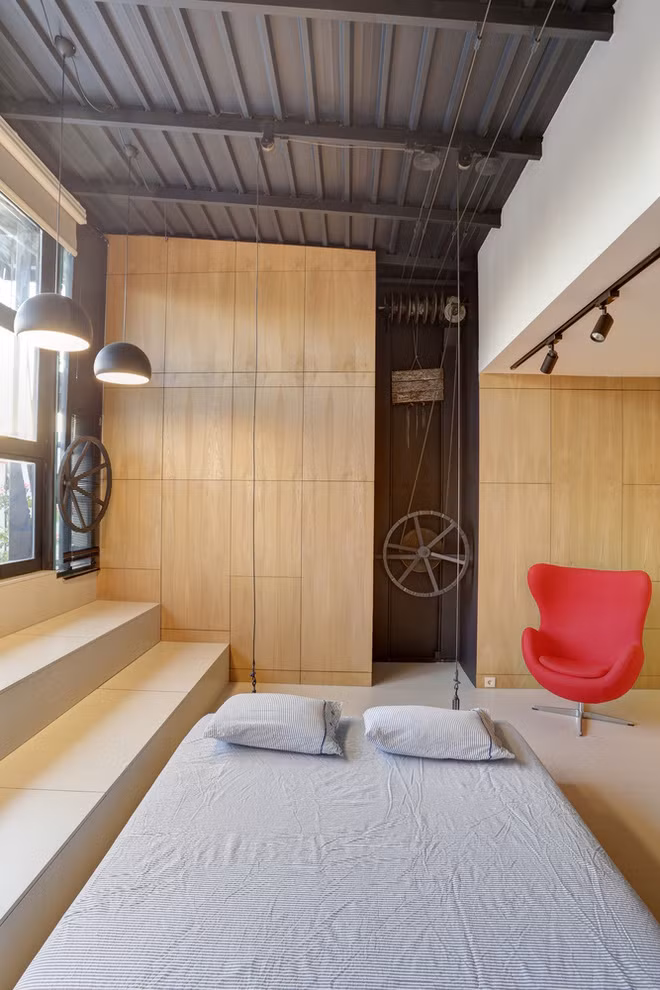 Chiếc giường treo chính là điểm độc đáo của căn hộ này, với hệ thống điều khiển bằng ròng rọc, chủ nhân có thể dễ dàng hạ nó sát xuống đất hoặc để nó ở mức độ lừng chừng, tùy theo nhu cầu sử dụng. Và khi sử dụng xong, chỉ cần quay ròng rọc là chiếc giường sẽ được cột lên trần nhà, trả lại không gian rộng thoáng để các thành viên có thêm không gian vui chơi, nghỉ ngơi.
