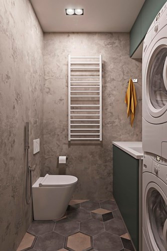 Tường phòng tắm trang trí bằng gạch thô giảm thiểu thời gian lau dọn, máy giặt kê sát tường tiết kiệm diện tích.