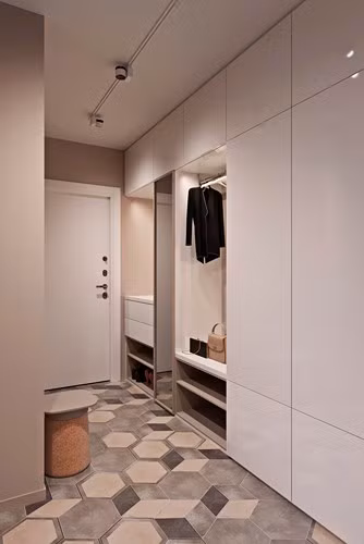 Hành lang dẫn tới phòng ngủ sử dụng gạch hình lục giác độc đáo, tủ quần áo đặt sát tường thuận tiện cho giờ cao điểm buổi sáng.