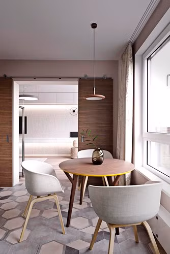 Bộ bàn ghế ăn bằng gỗ kê sát cửa sổ có thể sử dụng để làm bàn ăn sáng, bàn làm việc hay bàn đọc sách tùy ý.