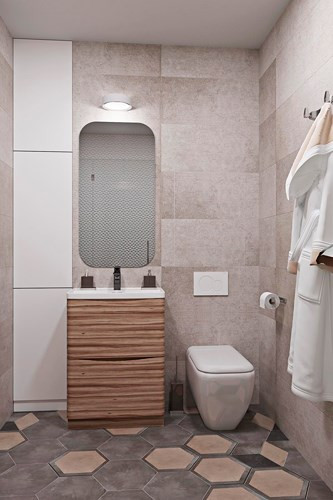 Thiết kế nội thất phòng tắm theo phong cách những năm 70 với chiếc gương hình chữ nhật đứng, bồn rửa làm bằng gỗ, sàn làm bằng gạch hình lục giác.