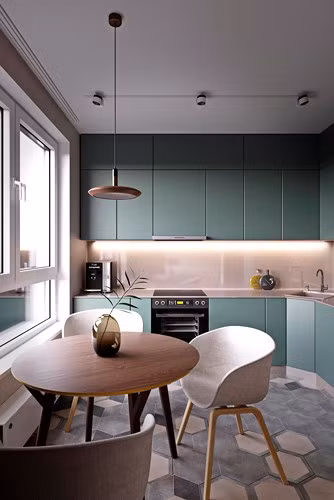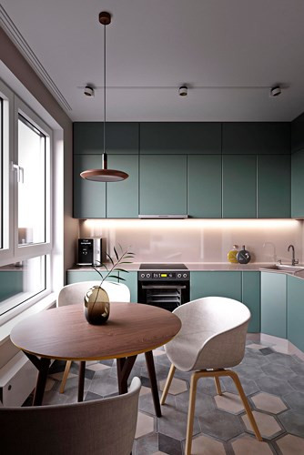 Tủ bếp màu xanh pastel vừa dung dị lại sạch sẽ, dễ dàng vệ sinh hàng ngày.