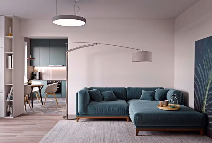 Trong phòng khách, một chiếc đèn sàn độc đáo được đánh bóng bằng đá và mạ crôm cung cấp ánh sáng khi chủ nhân cần đọc sách.