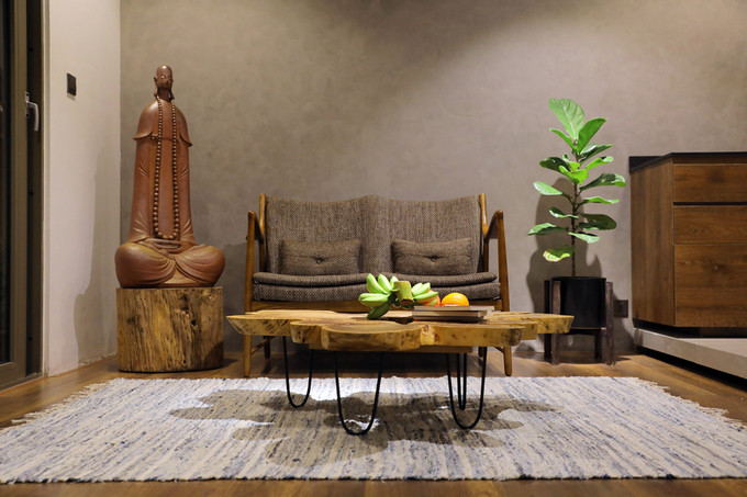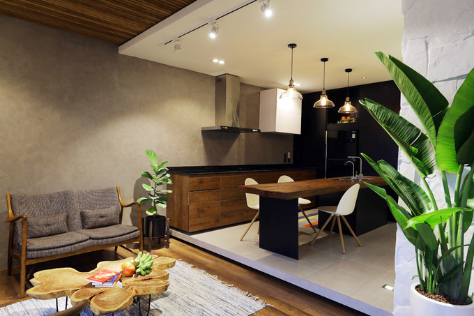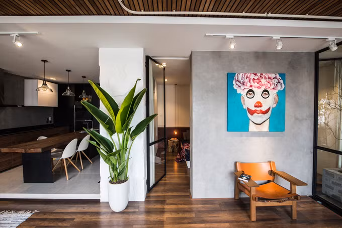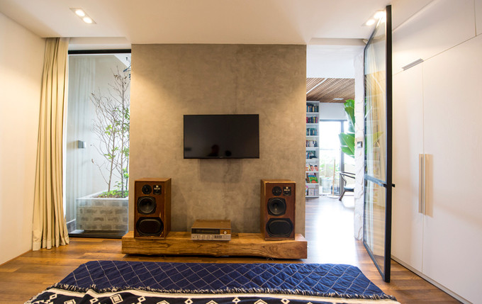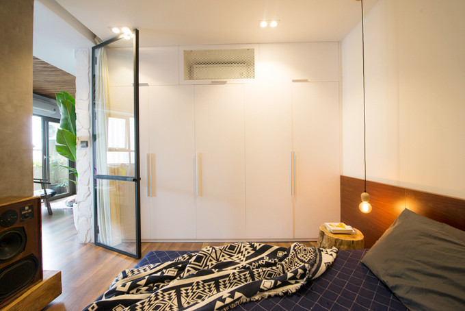 Trong căn hộ có sự kết hợp của nội thất hiện đại và các chi tiết mộc mạc. Người thiết kế cũng giấu đi những món đồ dễ phá đi nét đẹp tổng thể như điều hòa.