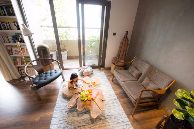 Khoảng không đó chạy suốt chiều rộng căn hộ với vách ngăn cơ động và nội thất thông minh để đón thêm nắng và gió.