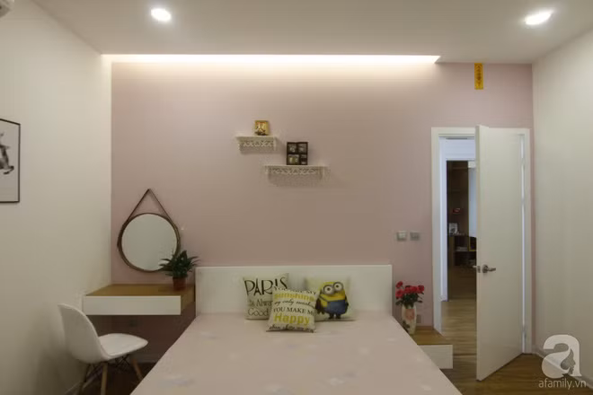 Chọn màu hồng pastel làm điểm nhấn cho tường, ánh sáng hắt từ phía trần tạo nên những khoảng nghệ thuật đầy ấn tượng và bắt mắt cho phòng ngủ.